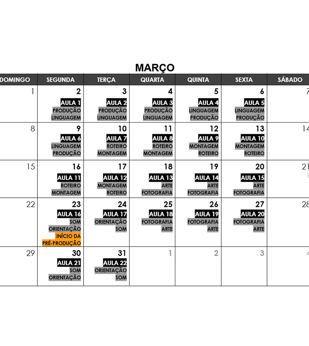 O curso contará com 28 aulas presenciais, onde os participantes trocarão experiências com diversos cineastas brasilienses experientes. Os encontros combinam teoria e prática abordando toda a cadeia produtiva. As atividades permitirão a aplicação direta dos conceitos aprendidos preparando os participantes para o trabalho de curso.